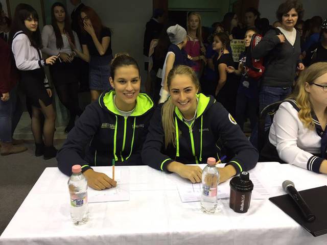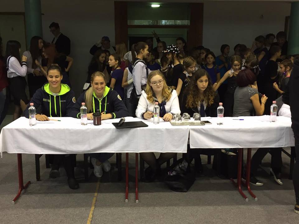 A zalaegerszegi Zrinyi Gimnázium gólyaavatójára kaptunk meghívást, amelynek örömmel tettünk eleget. Az utánpótlás csapatunkat erősítő Újhelyi Fanni volt a rendezvényen a műsorvezető. A zsűriben pedig Böröndy Vivien és Jurkó Noémi foglalt helyet. A vetélkedőben játékos feladatok során derült ki, melyik is a legrátermettebb a bejövő osztályok közül. Persze nem csak ez, hanem az előzetes feladatok is befolyásolták a vetélkedő kimenetelét. Ezek között szerepelt koreográfia és osztálytabló készítés, valamint egy szerenád az avató osztály ablaka alatt. A két lány remekül szórakozott, természetesen a fontos munka mellett.
