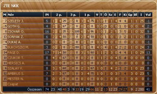ZTE NKK: Bukovszki 3/3, Zsovár 16/6, Szalay 8, Szélesy 5, Page 17 Cs.: Ambrus 7, Czukor 8, Sonyák 6, Góth 4, Dukai - Edző: Gáll Tamás