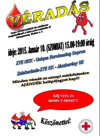 A hagyományokhoz híven, idén is segíti a ZTE KK és a ZTE NKK a Magyar Vöröskereszt munkáját. A január 10-i dupla mérkőzés alkalmával, a városlakókat, mérkőzésre járókat, szurkolóinkat kérjük, hogy véradásukkal segítsenek beteg embertársaik felgyógyulásában.