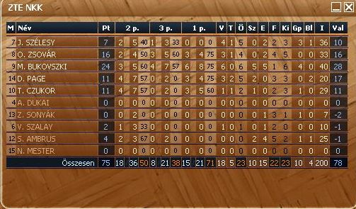 ZTE NKK: Bukovszki 24/12, Szélesy 7/3, Czukor 11, Zsovár 16/9, Page 11, csere: Szalay 2, Ambrus 4, Sonyák -, Mester -, Dukai -, Edző: Gáll Tamás